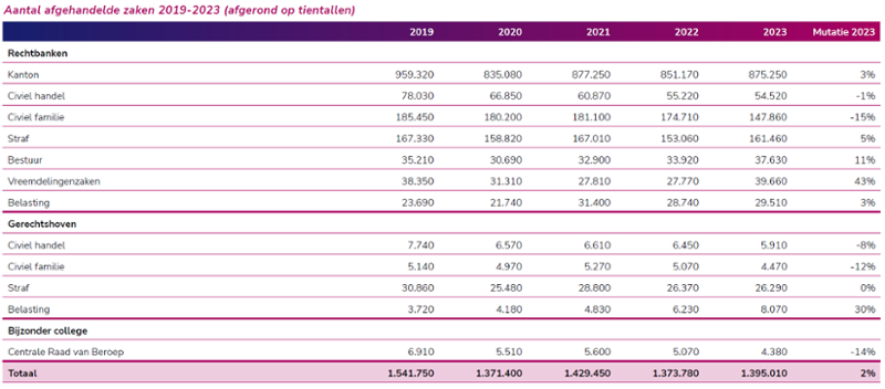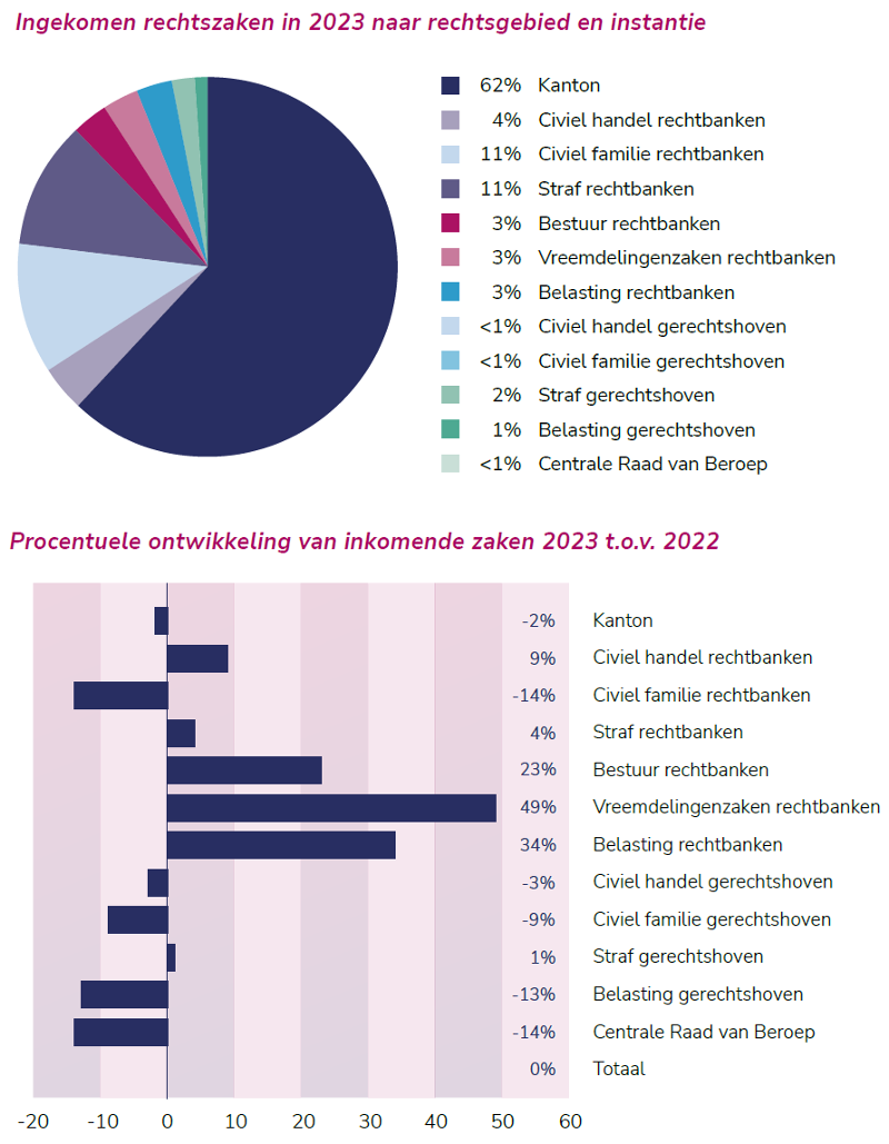 In totaal kwamen er in 2023 een kleine 1,40 miljoen zaken binnen bij de gerechten, waarmee het aantal nieuw ingekomen zaken ongeveer op hetzelfde niveau lag als in 2022. Voor meer dan de helft (62 procent, 859.000 zaken) betrof dit kantonzaken. Daarnaast waren er 486.000 inkomende zaken bij de rechtbanken (35 procent), 45.000 zaken (3 procent) bij de gerechtshoven en ruim 3.500 zaken bij de CRvB (<1 procent). In 2023 deed de relatief sterkste toename zich voor bij vreemdelingenzaken, belastingzaken en reguliere bestuurszaken bij de rechtbanken. De sterkste relatieve afname was te zien bij civiele familiezaken bij de rechtbanken, zaken bij de CRvB en belastingzaken bij de gerechtshoven.