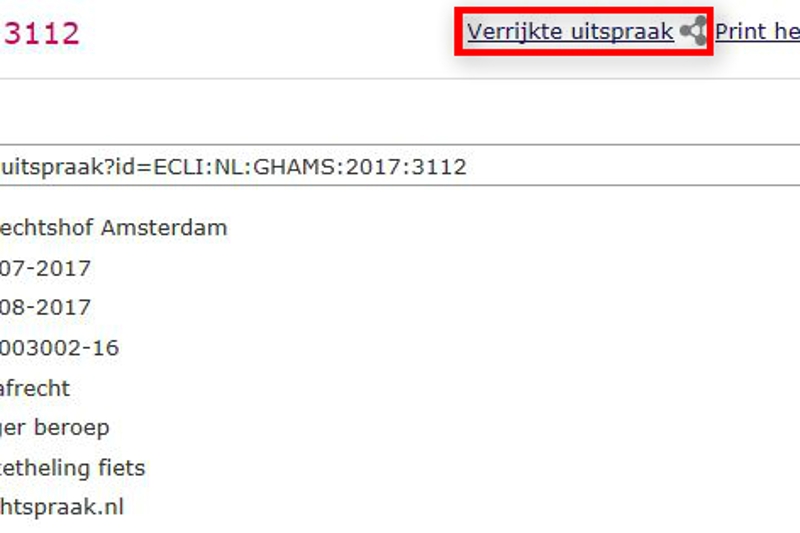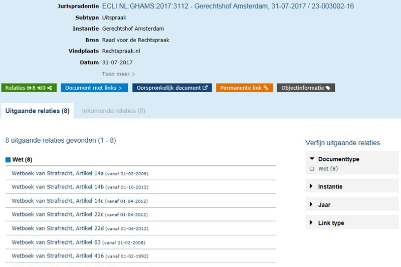 Via het uitsprakenregister van de Rechtspraak kan vanaf nu eenvoudig worden doorgeklikt naar de juridische bronnen waarnaar wordt verwezen in een uitspraak. Als de rechter in zijn uitspraak bijvoorbeeld wetteksten, Europese regelgeving of internationale verdragen noemt, worden deze in een handig overzicht getoond en zijn na een muisklik te lezen. Voorbeeld van verrijkte uitspraak (klik op de afbeelding om een voorbeeld te openen)