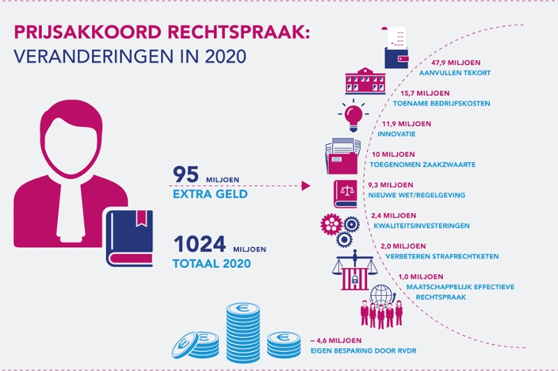 Ook is besloten dat de Rechtspraak anders wordt gefinancierd: vanaf volgend jaar worden vaste kosten voor een groot deel per zogenoemde lumpsum betaald, waardoor de daling van het aantal rechtszaken minder drukt op de begroting. Met dit prijsakkoord zijn de financiële tekorten weggewerkt. Henk Naves, voorzitter van de Raad voor de rechtspraakDe Raad voor de rechtspraak bestaat sinds 1 januari 2002 en vormt de schakel tussen de minister van Justitie en de gerechten. De Raad heeft als opdracht te bevorderen dat de gerechten hun rechtsprekende taak goed kunnen vervullen.: ‘We kunnen eindelijk weer investeren in onze organisatie. We gaan energie steken in meer toegankelijke rechtspraak, digitalisering en laagdrempelige voorzieningen voor conflictoplossing, zoals de buurtrechter en de wijkrechtbank’.