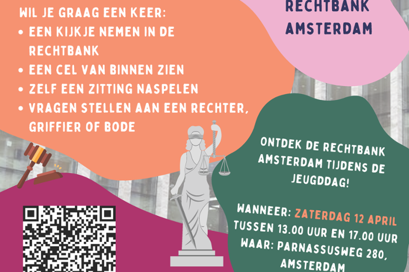 Speel mee tijdens een zitting van de jeugdrechtbank, volg een workshop straatcultuur, neem een kijkje in het cellencomplex of vraag rechters, griffiers, officieren en ervaringsdeskundigen het hemd van het lijf. Kinderen spelen op zaterdag 12 april zelf de hoofdrol in de Amsterdamse rechtbankRechtsprekend orgaan dat in eerste aanleg oordeelt over zaken zoals echtscheidingen, misdrijven, geldvorderingen, en de meeste bestuursrechtelijke geschillen. Ook wordt met het begrip rechtbank het gebouw aangeduid waarin de rechtbank zetelt..