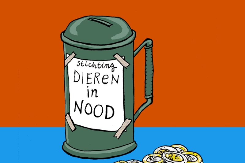 Op de collectebus zijn een dierenfoto en een A4’tje met ‘Dieren in Nood’ geplakt. Erg professioneel oogt het allemaal niet. Een achterdochtige buurtbewoner belt de politie. Zijn broer fotografeert de collectant, die zijn collectebus, gevuld met 9,60 euro, pardoes in de bosjes gooit als een politieauto de straat inrijdt. Directeur van de Stichting Dieren in Nood Michiel* is er gloeiend bij.