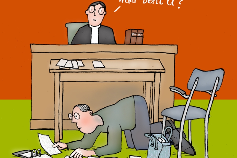 Cees grabbelt weer op de vloer en pakt de kadastertekeningen om uit te leggen hoe het zit met het erf en de tuin. Politierechter Joha: 'Ik begrijp dat het u hoog zit, maar we gaan het niet hebben over kadasterstukken of de erfgrens. We hebben het ook niet over de grieven die hebt over uw buurman. U bent nu bij de strafrechter, niet bij de civiele rechter. Er ligt een aangifte, en ik wil weten wat er is gebeurd.' Het blijft stil. 'Waar bent u, mijnheer?' Het computerscherm beneemt de rechter het zicht. (In Leeuwarden zit de verdachteIemand over wie aanwijzingen bestaan dat hij mogelijk een strafbaar feit heeft gepleegd. De wet spreekt over "een redelijk vermoeden van schuld". Een verdachte wordt pas dader genoemd nadat hij is veroordeeld. pal voor de rechter, die gewoontegetrouw op een podium zit.) Cees speurt onder zijn stoel naar papieren. De rechter: 'Ik weet niet wat u aan het doen bent, maar ik wil met u praten over wat u zich herinnert.' 'Ik zal voorlezen wat er in die dagen is gebeurd', reageert Cees, die een agenda heeft opgeduikeld. Daarin staat dat hij een stuk uit de schutting heeft gehaald en een bord met verboden toegang heeft neergezet. 'Er staat niets in over gerooide boompjes.' Dat heeft de buurman 'uit zijn duim gezogen'.