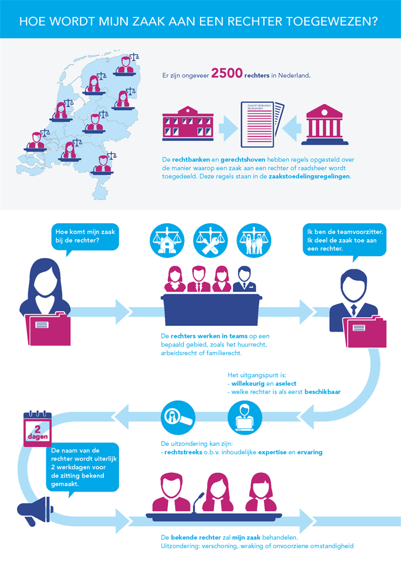 De Code zaakstoedeling heeft tot doel te waarborgen dat rechtszaken op basis van objectieve maatstaven aan de rechters worden toegedeeld. De wijze van toedeling van zaken aan rechters wordt daardoor transparanter. De Code zaakstoedeling is op 27 januari 2020 vastgesteld door het Overleg van presidenten van de gerechten en leden van de Raad voor de rechtspraakDe Raad voor de rechtspraak bestaat sinds 1 januari 2002 en vormt de schakel tussen de minister van Justitie en de gerechten. De Raad heeft als opdracht te bevorderen dat de gerechten hun rechtsprekende taak goed kunnen vervullen..